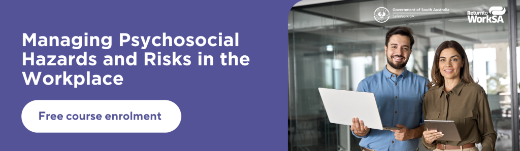 To help workplaces take practical steps, ReturnToWorkSA and SafeWork SA have developed a free online module: Managing Psychosocial Hazards and Risks in the Workplace.